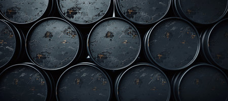 A close-up of petroleum oil barrels stacked, with ample space above for copy
