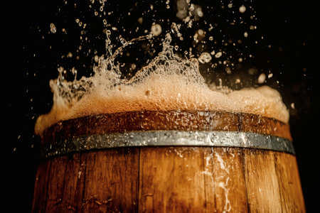 A wooden barrel overflowing with frothy beer, creating a splash of bubbles. The active scene captures the vitality of brewing, emphasizing frothiness and movement. The rich texture of the barrel contrasts with the golden hues of the beer.