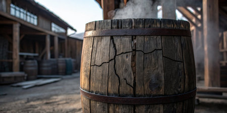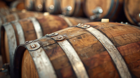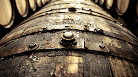 This close-up image showcases the intricate details of a wooden barrel, focusing on its metal bands and weathered texture, evoking a sense of craftsmanship.
