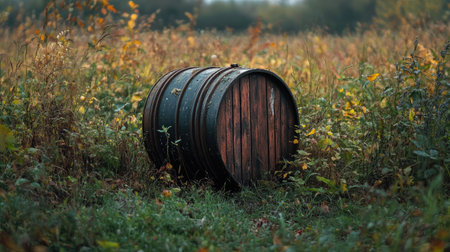 aged barrel surrounded by fallen autumn leaves, created with generative ai