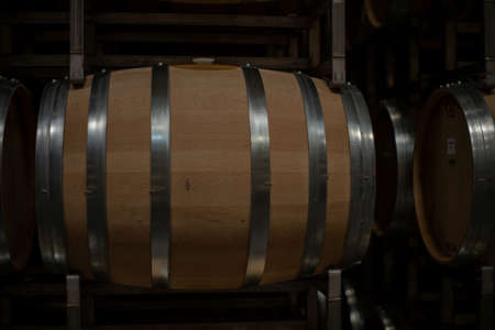 Wine oak barrels in which red wine is aged in the cellar of the winery. The concept of the production of wine