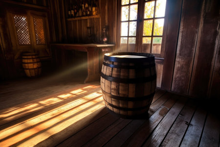 sunlight casting shadows on wooden barrel, created with generative ai