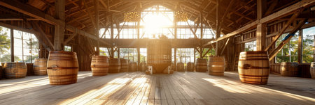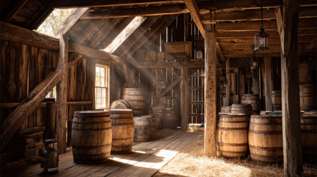 Bright sunlight streams into a rustic barn, highlighting wooden barrels and beams, creating a cozy and inviting space.