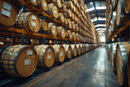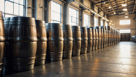Aging facility with rows of whiskey, bourbon, and scotch barrels in a distillery