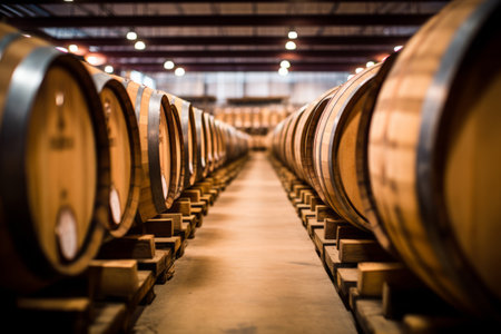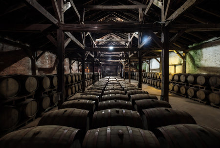 Rows of wooden barrels fill a dimly lit warehouse space. The composition shows the barrels lined up in a neat, symmetrical pattern with a walkway through the center. Warm tones of wood dominate the scene, and the lighting is diffused creating a sense of age. The image could be used for illustrations or background for commercial projects.