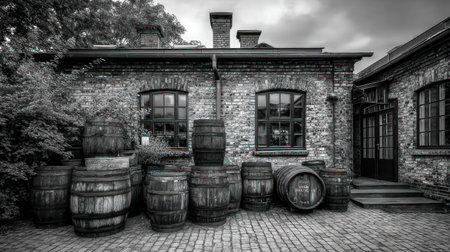 A grayscale image showcases multiple weathered wooden barrels arranged in front of a brick building. The architectural structure features arched windows and a simple roofline. The scene appears to be outdoors under overcast skies, emphasizing texture and form. The photograph's elements lend themselves to various commercial and illustrative applications.