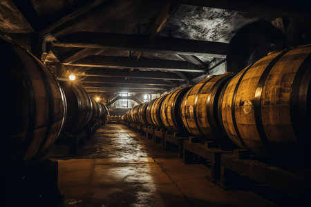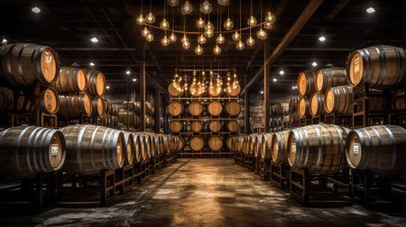 Wooden oak barrels in beer cellar of brewery. Craft drink production and perfect storage. Generative AI