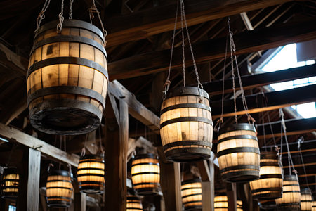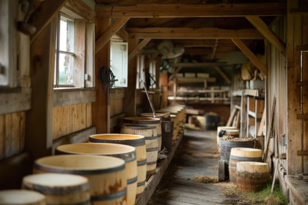 Artisan beer brewing in wooden barrels at rustic countryside barn for local craft beer promotion