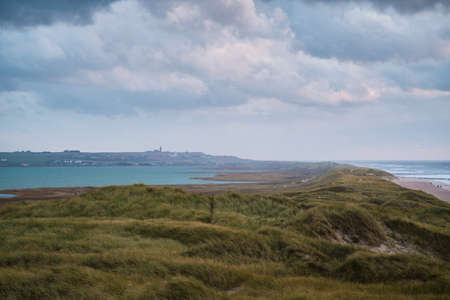 Sand dunes on the island of Amrum in spring on a cloudy, atmospheric day at low tide. Idyllic picturesque landscape with dry grass.