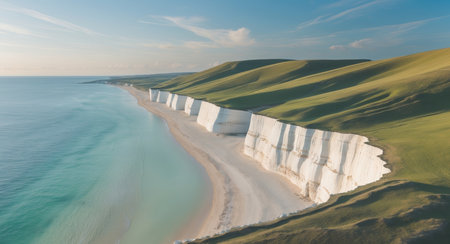 AI Generated. Aerial view of layered white cliffs and green hills meeting a turquoise sea and a sandy beach
