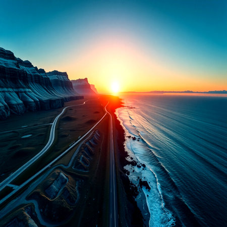 Generative AI : Aerial view from Reynisdrangar viewpoint with views over the road to Dyrholaey Arnardrangur Reynisfjara Dyrholavegur Iceland