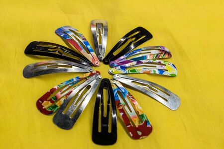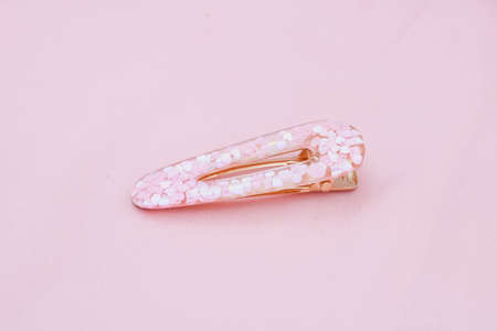 Cute Colorful Hair Pin of Hair Accessories. Bobby Pin from The 90s. Set Colored Hair Clips Isolated on Pink Fabric Background Great For Any Use.