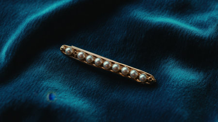 A refined gold brooch adorned with lustrous pearls, beautifully displayed on a lush blue velvet fabric. Perfect for fashion lovers and collectors.