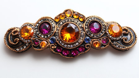 Stunning brooch showcasing a variety of vibrant gemstones in warm hues, featuring intricate detailing and a luxurious design perfect for any fashionable outfit.