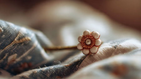 Close-up of a delicate flower-shaped pin brooch resting on a soft, patterned textile surface.