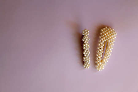 Two fashionable pearl barrette on pastel pink background. Top view.