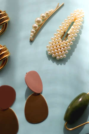 Coral blush, jade roller, pearl barrettes and gold earrings on bright blue background. Selective focus.