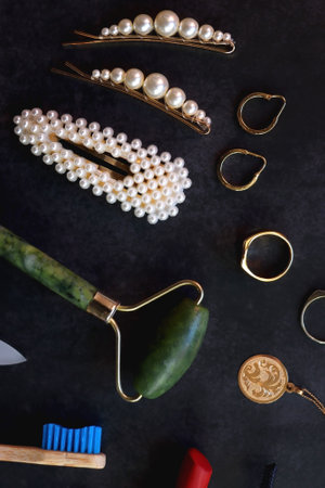 Various beauty products, accessories and jewelry on dark background. Top view.