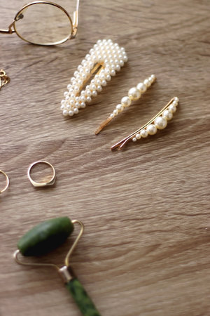 Pearl headband and barrette, golden eyeglasses, gold necklace, earrings and rings, jade face roller and hair pins on wooden background. Various elegant gold accessories.