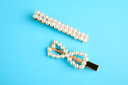 Beautiful bijouterie. Elegant hair clips on light blue background, top view