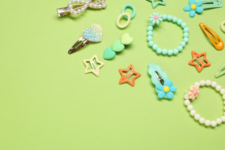 Banner with small multicolored hair scrunchies and clips on a yellow background. Place for your design.