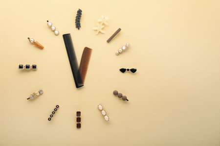 Clock shape made of combs and hair clips on beige background, flat lay. Space for text