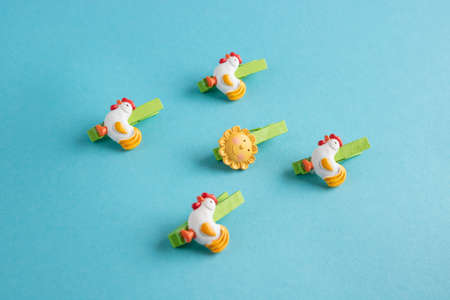 Five Easter clothes pins on a blue background. Minimalistic Easter concept.