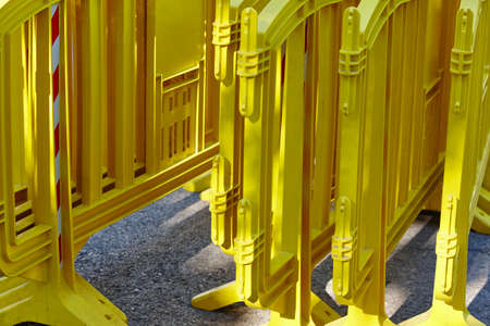 Yellow plastic barrier fence over an asphalt road. Security