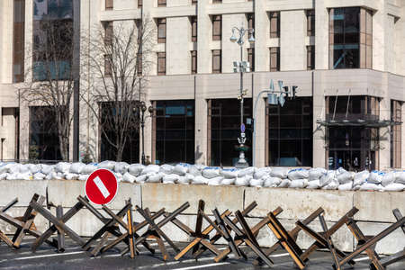 Military roadblock and obstacles in the streets Kyiv capital of Ukraine. The objective is to prevent any enemy operation. It acts as protection for friendly troops. The preparation of such a barrage is normally a priority engineer task.