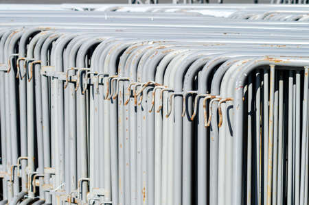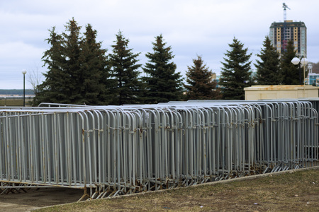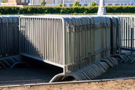 Stacked metal barriers on the city street. Metal barricades, prepared for an event or construction