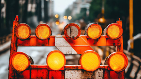 A vivid image showcasing a traffic signal barrier with blinking orange lights in a damp urban environment, emphasizing road work safety for vehicles and pedestrians.