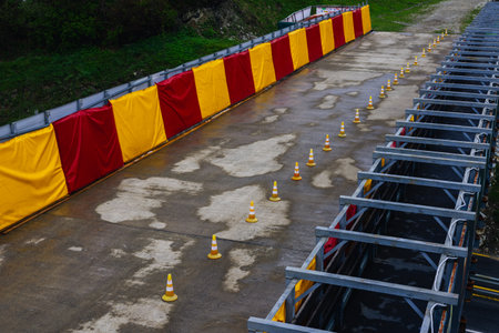 Vibrant cones in preparation for a race or training session. A shot of an empty luge track, featuring red and yellow barriers, with safety cones guiding the way. The track is slightly wet. Aerial view