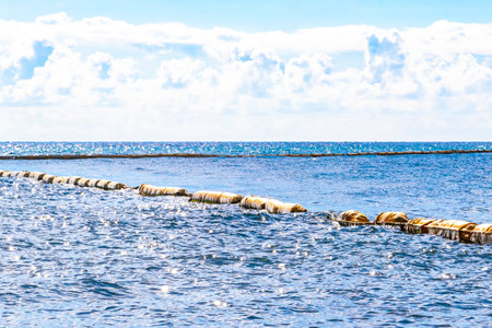 Beautiful blue and turquoise water waves ocean and yellow red orange Buoy buoys ropes and nets in the water of Playa del Carmen in Quintana Roo Mexico.