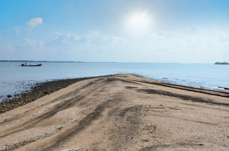 View of the sea, where you can see small islands and ships and banana boats. Beautiful Ancol Beach.
