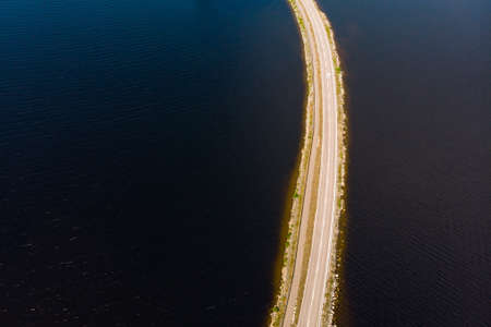 Aerial view of road on Pulkkilanharju Ridge at lake Paijanne, Paijanne National Park, Finland.