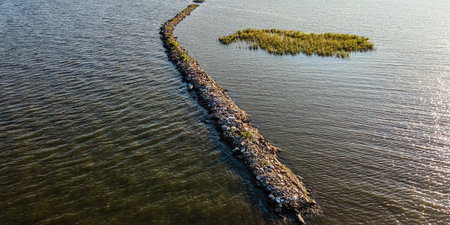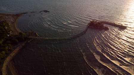 Aerial drone view of a stone breakwater or jetty in Baltic sea, Baltiysk, Kaliningrad, Russia at sunset. top view