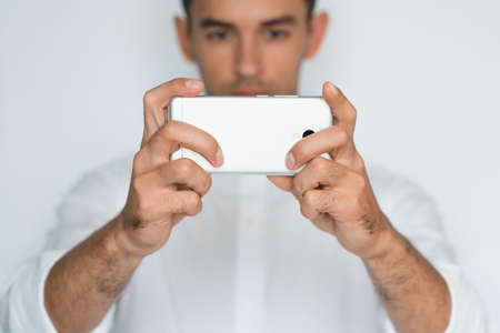 Portrait of handsome caucasian man taking a selfie with smart phone isolated on white background. Young businessman play in application. Look at front.