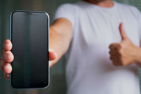a person using a smartphone on green bokeh background, male hand holding a smartphone