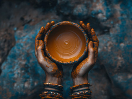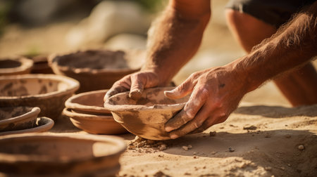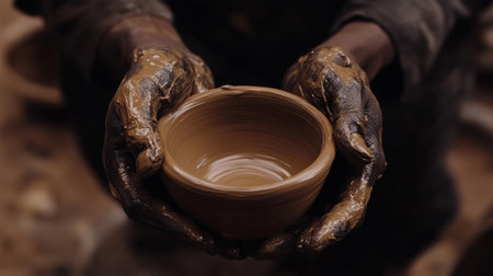 Artisan Shaping Clay Bowl Hands of a Potter in Rustic Workshop Ambience.