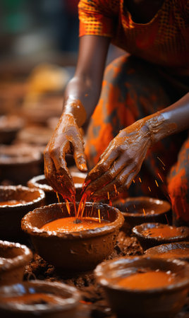 A person is pouring water into a clay pot with a concentrated expression on their face, Chai being poured from a height into a clay cup, creating splashes, AI Generated