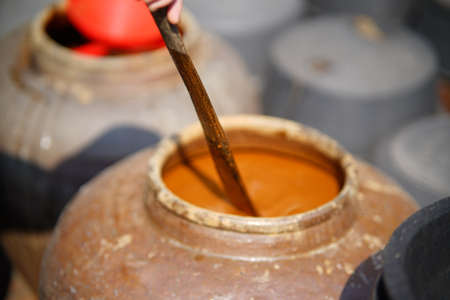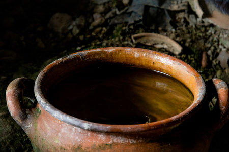 Clay pot with a brown liquid in it sits on a wooden table. There are other clay pots and bowls on the table as well