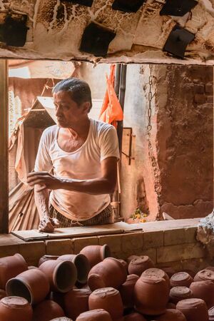 Mumbai, India - February 26, 2019: Indian man puts clay pots in pottery kiln in Dharavi Slum at Mumbai. India