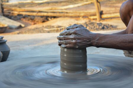 hands of a potter forming clay on a potters wheel in action, creative process, making pottery, Heritage Craft.