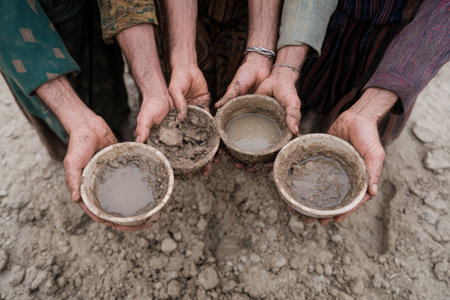 Hands holding bowls with muddy water, symbolizing a water crisis, featuring earthy tones, and expressing concern for the environment and health