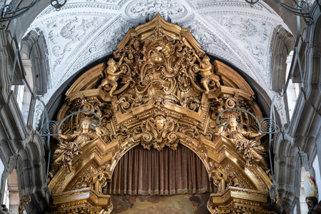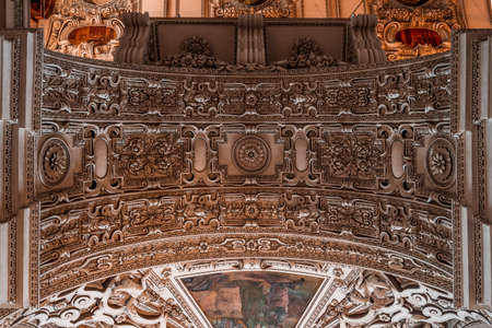 Upward view of marble arch between nave and aisle with exquisite ornamentation inside Salzburg Cathedral