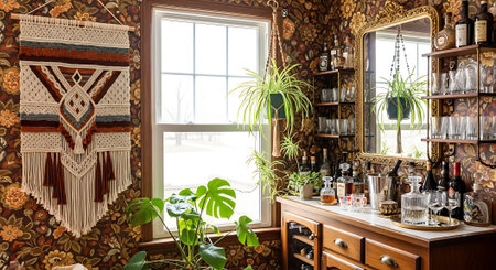 Home bar is stocked with a variety of liquor bottles and cocktail accessories, creating an inviting atmosphere for entertaining