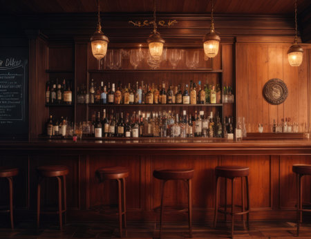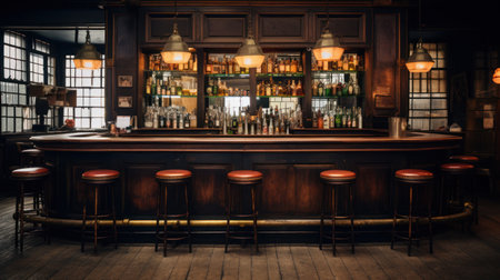 Interior of a pub with bar counter, bar chairs and bottles