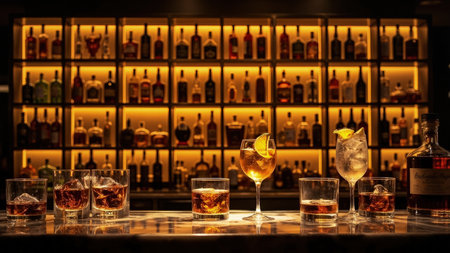 A sophisticated evening scene in a luxurious bar. Gleaming bottles of whiskey, liquor, and other spirits line the back bar, illuminated by warm lighting. Garnished cocktails and elegant glassware complete the image, perfect for representing upscale nightlife, fine spirits, or the ambiance of a high-end establishment.