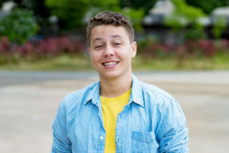 Portrait of laughing german young adult man outdoor in city