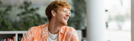Young man with red hair and glasses studying in front of bookshelf.